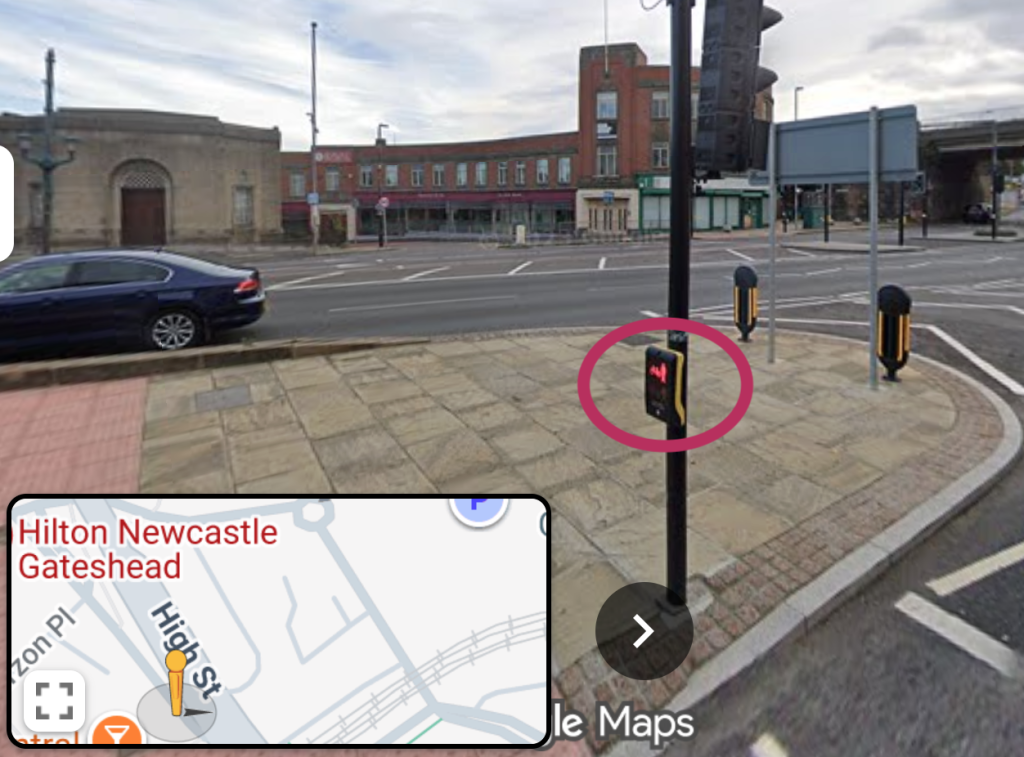 Yes, the pedestrian crossing lights were to my left or right, not straight ahead. I didn’t get a picture while I was there, so this Google Map image is the closest example. Note where the pedestrian crossing light is that I’ve circled – beside you, not ahead of you.